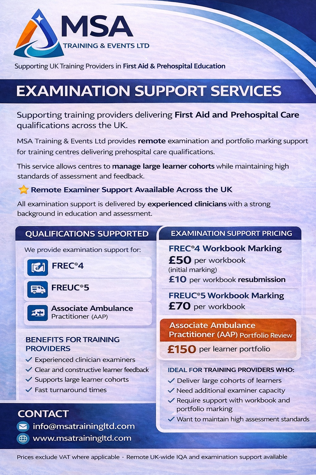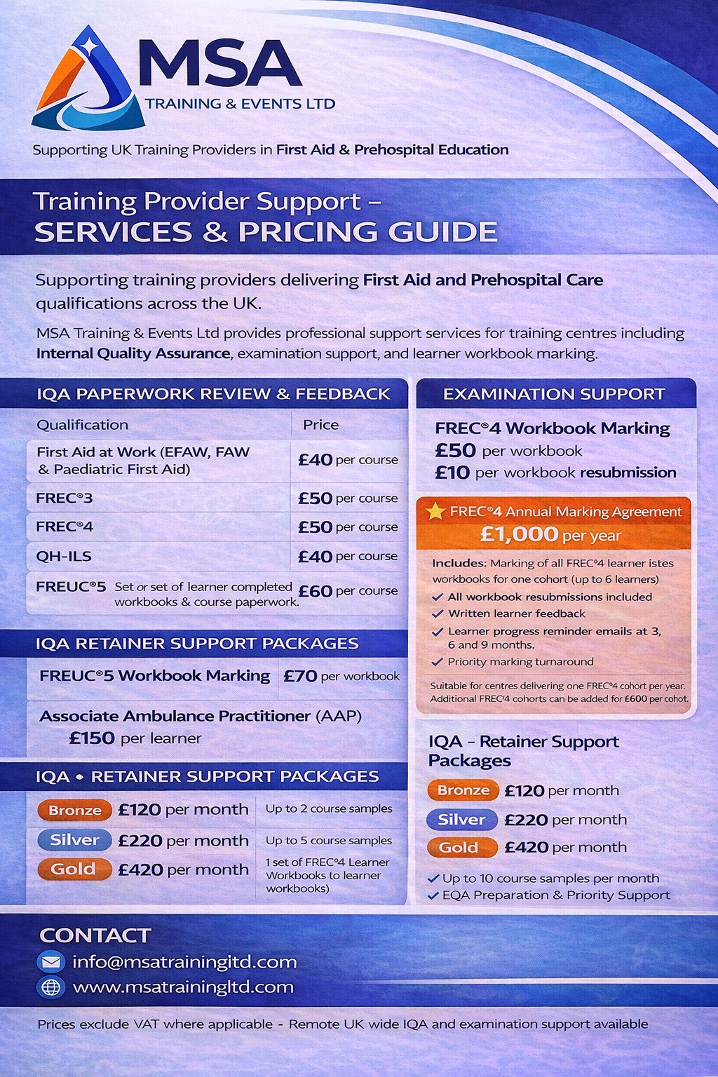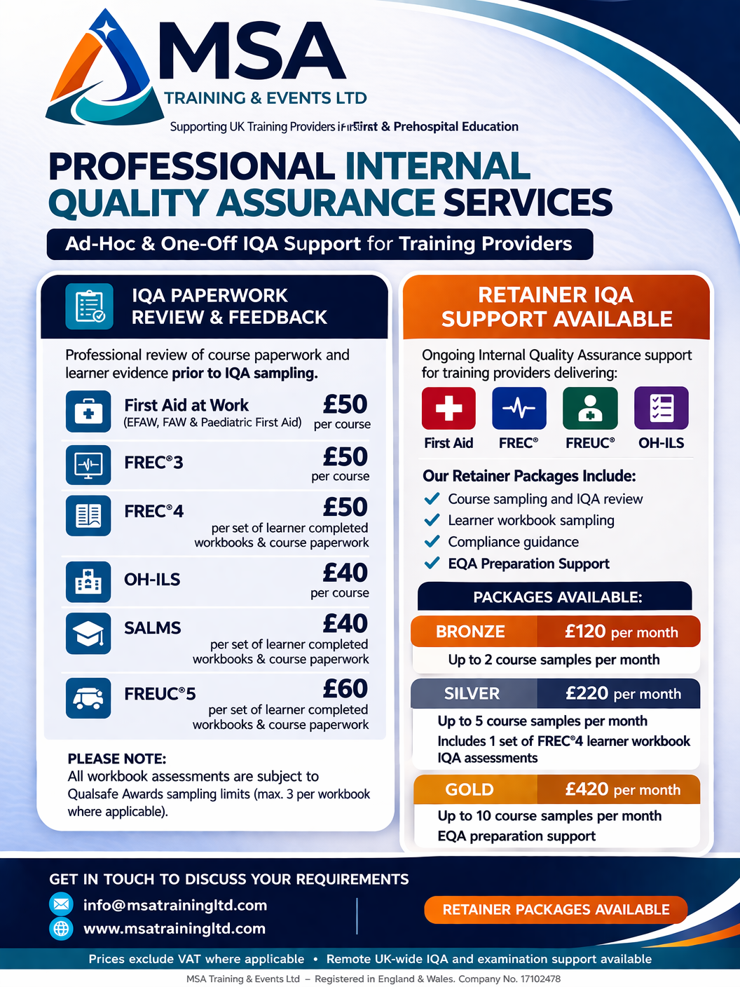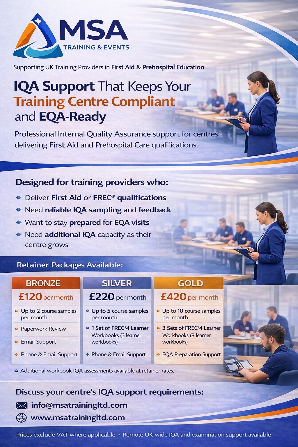 Our mission is to support training providers across the UK by delivering professional IQA, examiner support, and training services that ensure high standards of quality, compliance, and learner development within First Aid and Prehospital Care education.